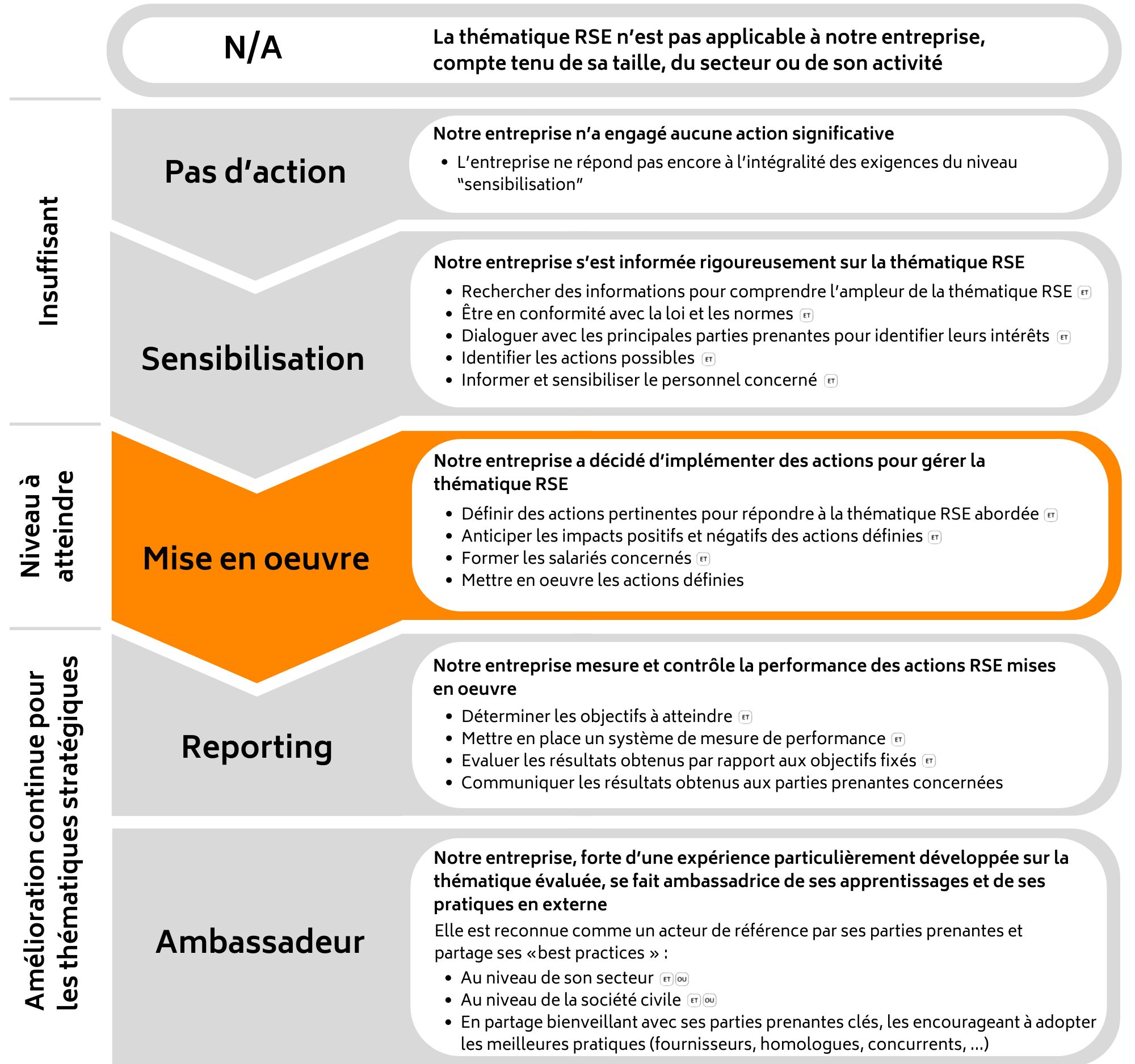 Pour évaluer votre performance par rapport à une thématique RSE spécifique, veuillez sélectionner le niveau de maturité qui correspond à votre comportement actuel. Afin de le choisir correctement, assurez-vous que votre entreprise remplit toutes les conditions requises. Les exigences à respecter pour chaque niveau de maturité sont présentées dans le tableau ci-après.