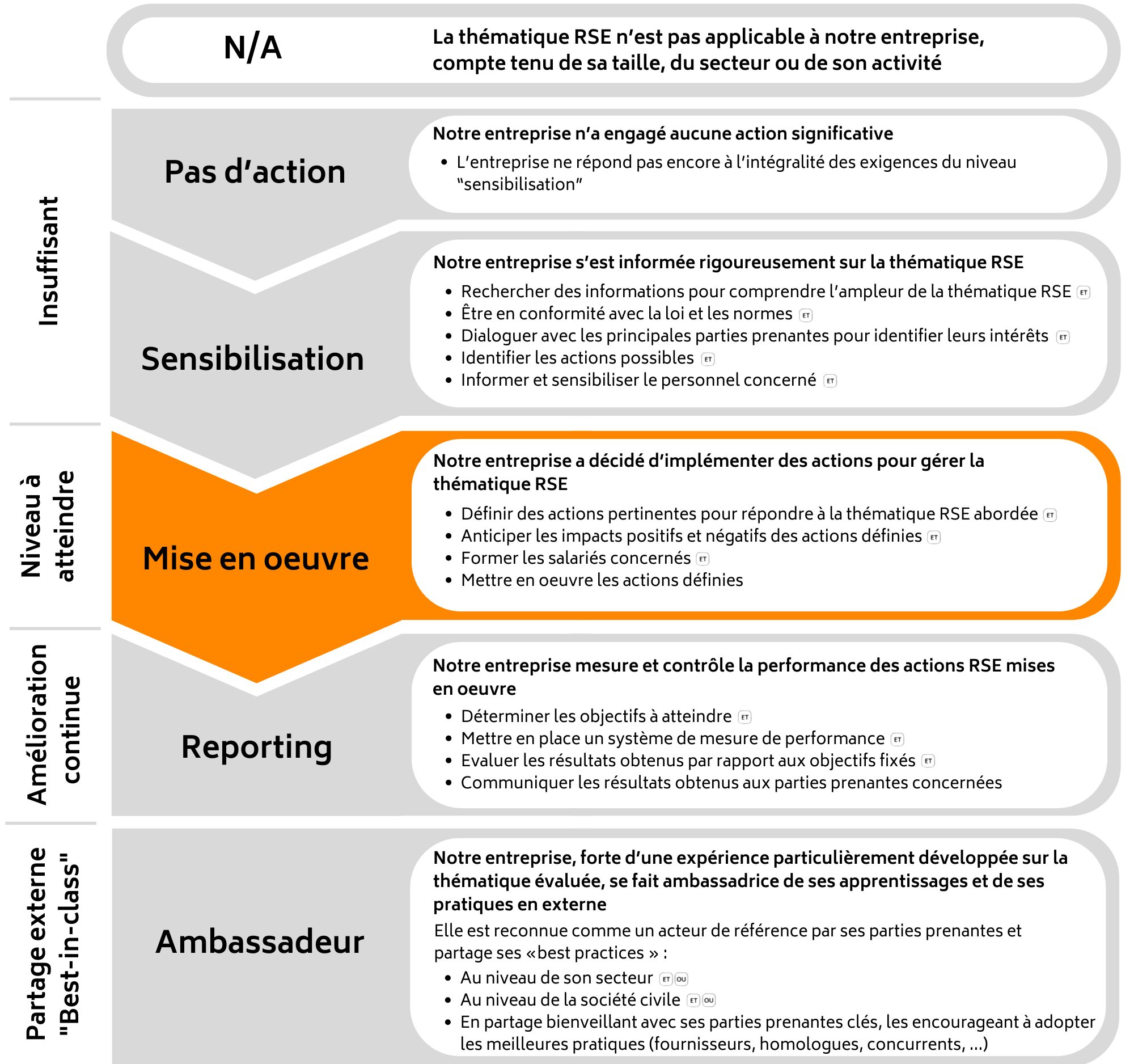 Pour évaluer votre performance RSE en rapport à une thématique ESR – ENTREPRISE RESPONSABLE spécifique, veuillez sélectionner le niveau de maturité qui correspond au comportement actuel de votre entreprise, afin de sélectionner correctement ce dernier. Assurez-vous que votre entreprise remplit toutes les conditions requises. Les exigences à respecter pour chaque niveau de maturité sont présentées dans le tableau ci-après.